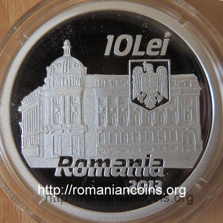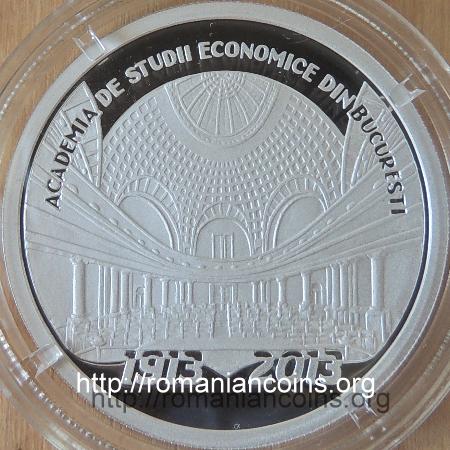 37 mm diametru, 31.103 g, 99.9% argint, margine cu zimți Avers: valoarea nominală 10 LEI, stema României, ROMANIA, anul 2013, palatul Academiei de Științe Economice din București | Revers: aula din palatul ASE, inscripția ACADEMIA DE STUDII ECONOMICE DIN BUCURESTI, anii 1913 și 2013