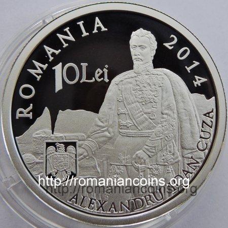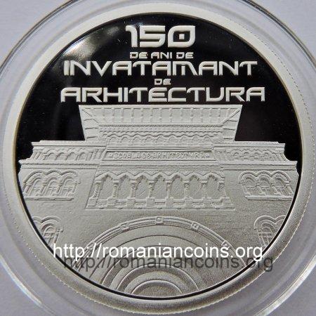37 mm diametru, 31.103 g, 99.9% argint, margine cu zimți Avers: ROMANIA, valoarea nominală 10 LEI, anul 2014, stema României, Alexandru Ioan Cuza purtînd hlamida domnească (fotografie de Carol Popp de Szatmari) | Revers: palatul Universității de Arhitectură și Urbanism Ion Mincu din București, inscripția 150 DE ANI DE INVATAMANT DE ARHITECTURA