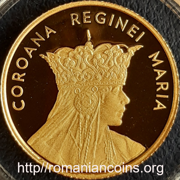 13.92 mm diametru, 1.224 g, aur 99.9%, margine cu zimți Avers: ROMANIA, stema României, valoarea nominală 10 LEI, anul 2015, coroana reginei Maria | Revers: regina Maria purtîndu-și coroana, inscripția COROANA REGINEI MARIA