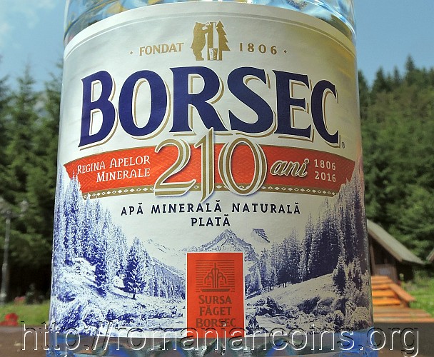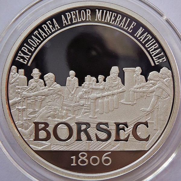 37 mm diametru, 31.103 g, argint 99.9%, margine cu zimți Avers: ROMANIA, stema României, valoarea nominală 10 LEI, anul 2016, o imagine din orașul Borsec | Revers: un atelier de îmbuteliere a apei minerale (imagine de epocă), inscripția EXPLOATAREA APELOR MINERALE NATURALE BORSEC, anul 1806