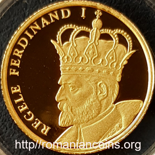 13.92 mm diametru, 1.224 g, 90% aur, margine cu zimți Avers: anul 2016, stema României, valoarea nominală 10 LEI, ROMANIA, detaliu al buzduganului regelui Ferdinand I | Revers: regele Ferdinand, purtînd coroana de oțel a României, inscripția REGELE FERDINAND I