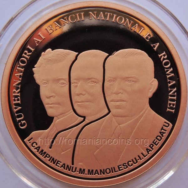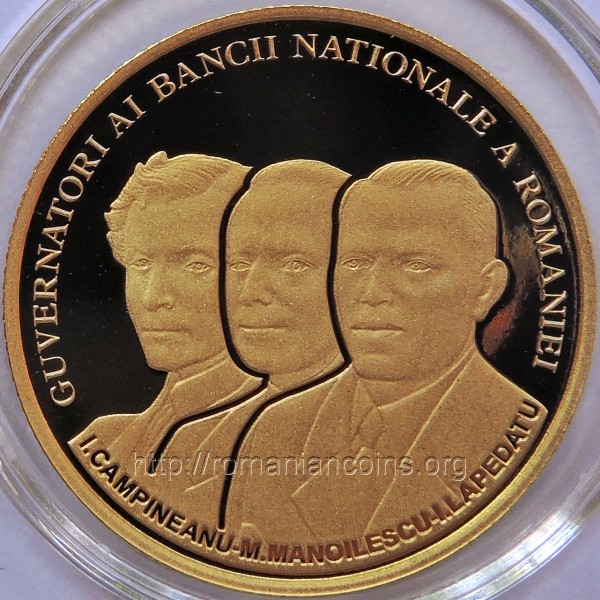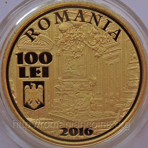 21 mm diametru, 6.452 g, aur 90%, margine cu zimţi Avers: ROMANIA, valoarea nominală 100 LEI, stema României, anul 2016, Cabinetul Guvernatorului - sală din palatul BNR (imagine de epocă) | Revers: efigiile celor trei guvernatori BNR omagiaţi, inscripţia I. CAMPINEANU - M. MANOILESCU - I. LAPEDATU GUVERNATORI AI BANCII NATIONALE A ROMANIEI