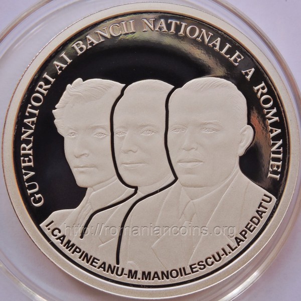 37 mm diametru, 31.103 g, 99.9% argint, margine cu zimţi Avers: ROMANIA, valoarea nominală 10 LEI, stema României, anul 2016, Cabinetul Guvernatorului - sală din palatul BNR (imagine de epocă) | Revers: efigiile celor trei guvernatori BNR omagiaţi, inscripţia I. CAMPINEANU - M. MANOILESCU - I. LAPEDATU GUVERNATORI AI BANCII NATIONALE A ROMANIEI