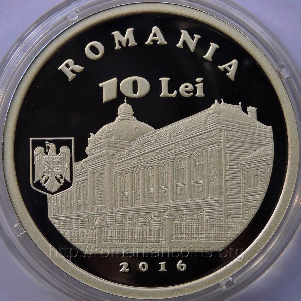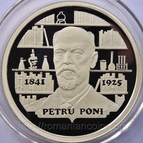 37 mm diametru, 31.103 g, argint 99.9%, margine cu zimți Avers: ROMANIA, valoarea nominală 10 LEI, stema României, anul 2016, o imagine de epocă a Universității din Iași (Petru Poni a fost și profesor universitar la Iași) | Revers: efigia lui Petru Poni, în plan secund rafturi de cărți și instrumente științifice, anii 1841 și 1925, inscripția PETRU PONI