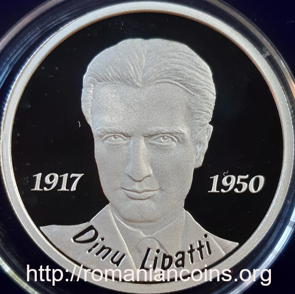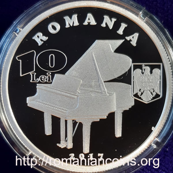 37 mm diametru, 31.103 g, argint 99.9%, margine cu zimți Avers: ROMANIA, valoarea nominală 10 LEI, stema României, anul 2017, un pian | Revers: chipul pianistului, inscripția Dinu Lipatti, anii 1917 și 1950