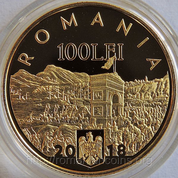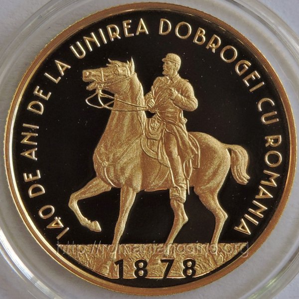 21 mm diametru, 6.452 g, aur 90%, margine cu zimți Avers: ROMANIA, valoarea nominală 100 LEI, anul 2018, stema României, o porțiune dintr-o litografie de epocă reprezentînd trecerii armatei române în Dobrogea, realizată de artistul Henryk Dembitzky | Revers: Carol I călare, inscripția 140 DE ANI DE LA UNIREA DOBROGEI CU ROMANIA și anul 1878
