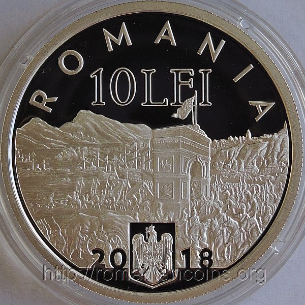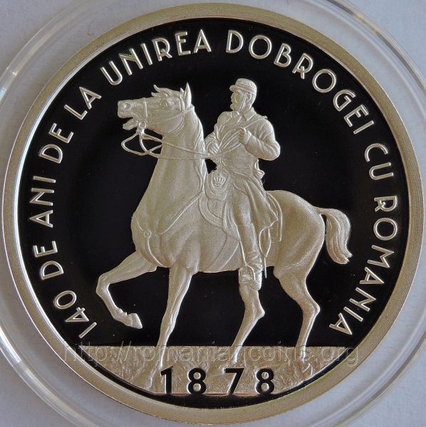 37 mm diametru, 31.103 g, 99.9% argint, margine cu zimți Avers: ROMANIA, valoarea nominală 10 LEI, anul 2018, stema României, o porțiune dintr-o litografie de epocă reprezentînd trecerii armatei române în Dobrogea, realizată de artistul Henryk Dembitzky | Revers: Carol I călare, inscripția 140 DE ANI DE LA UNIREA DOBROGEI CU ROMANIA și anul 1878