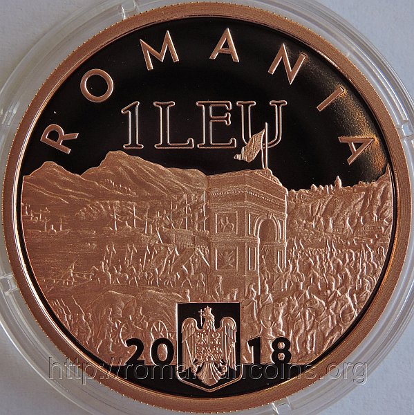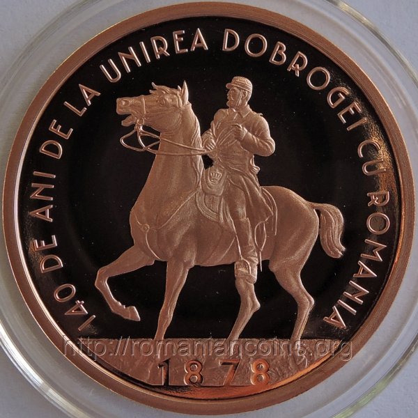 37 mm diametru, 23.5 g, tombac cuprat, margine cu zimți Avers: ROMANIA, valoarea nominală 1 LEU, anul 2018, stema României, o porțiune dintr-o litografie de epocă reprezentînd trecerii armatei române în Dobrogea, realizată de artistul Henryk Dembitzky | Revers: Carol I călare, inscripția 140 DE ANI DE LA UNIREA DOBROGEI CU ROMANIA și anul 1878