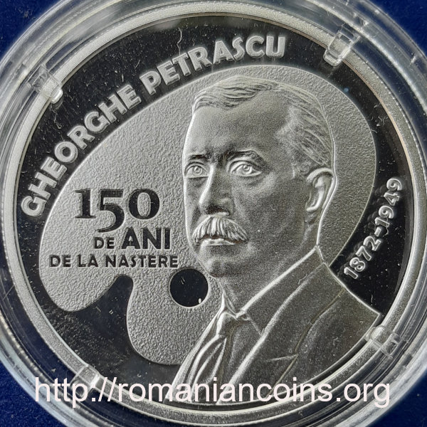 37 mm diametru, 31.103 g, argint 99.9%, margine cu zimţi Avers: ROMANIA, valoarea nominală 10 LEI, anul 2022, stema României, un colț dintr-un tablou pictat de Gheorghe Petrașcu | Revers: o paletă de pictură, chipul pictorul, inscripția GHEORGHE PETRASCU 150 DE ANI DE LA NASTERE și anii 1872-1949