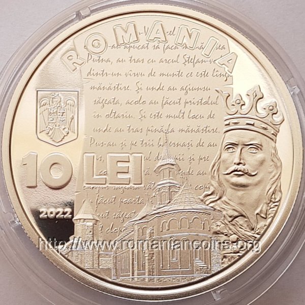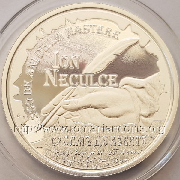 37 mm diametru, 31.103 g, argint 99.9%, margine cu zimţi Avers: ROMANIA, stema României, valoarea nominală 10 LEI, anul 2022, mănăstirea Putna și chipul domnitorului Ștefan cel Mare, în mijloc un fragment din „O samă de cuvinte” cu începutul celei de a treia legende - despre întemeierii mănăstirii Putna | Revers: o mînă ținînd o pană de scris, un fragment de început dintr-un manuscris de epocă al lucrării „O samă de cuvinte”, inscripțiile 350 DE ANI DE LA NASTERE și ION NECULCE