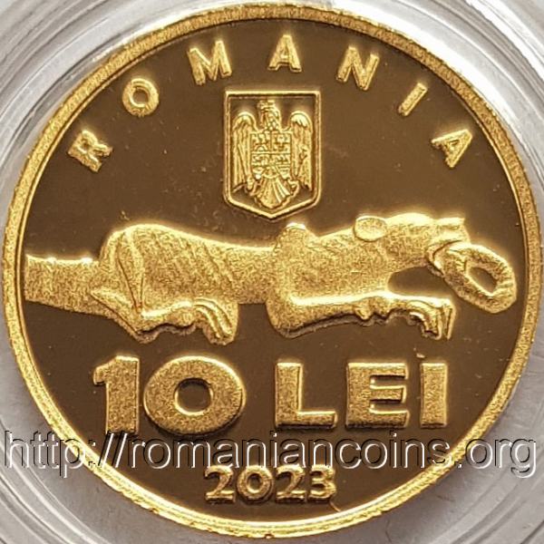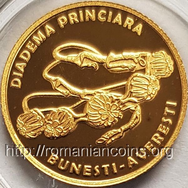 13.92 mm diametru, 1.224 g, 90% aur, margine cu zimți Avers: ROMANIA, stema României, valoarea nominală 10 LEI, anul 2023, un capăt al diademei princiare de la Bunești-Averești, în formă de animal | Revers: o imagine a diademei și inscripția DIADEMA PRINCIARA BUNESTI-AVERESTI