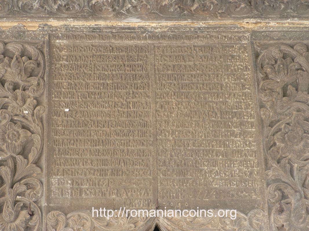 Pisania bisericii este împărțită în două registre. Cel din stînga este scris în grecește. Pe primele două rînduri ale inscripției din partea dreaptă, care este scrisă în românește cu slove, se poate citi: „Această sfîntă și dumnezeiască biserică s-au zidit...”. În partea de jos apare anul 1724, în care biserica a fost zidită.
