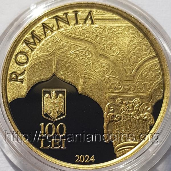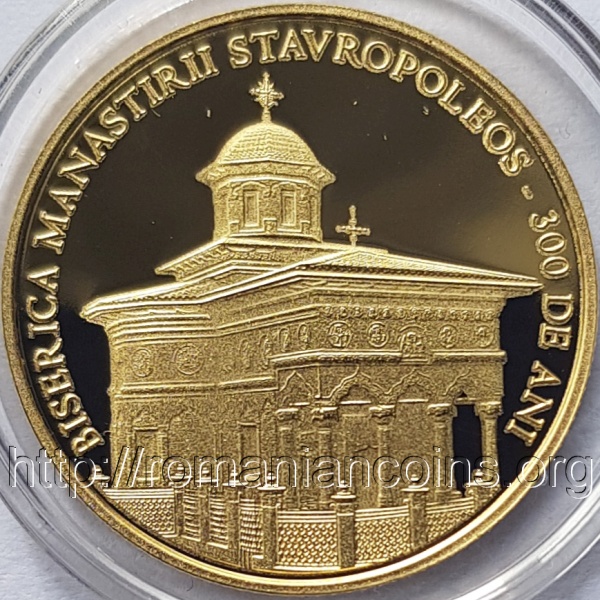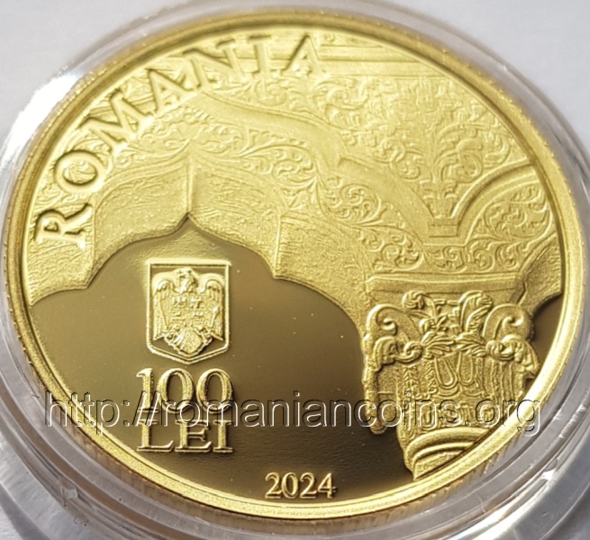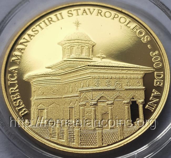 21 mm diametru, 6.452 g, aur 90%, margine cu zimţi Avers: ROMANIA, stema României, valoarea nominală 100 LEI, anul 2024, ornamente în stil brâncovenesc din pridvorul bisericii Stavropoleos | Revers: inscripția BISERICA MANASTIRII STAVROPOLEOS – 300 DE ANI și o imagine a bisericii Stavropoleos
