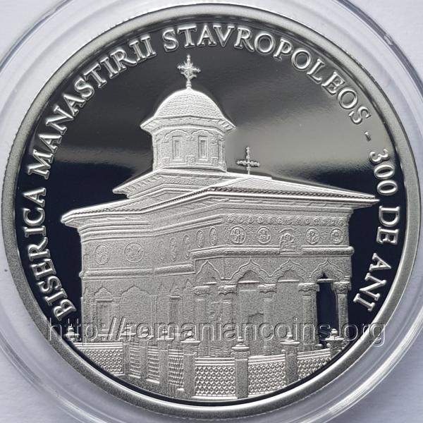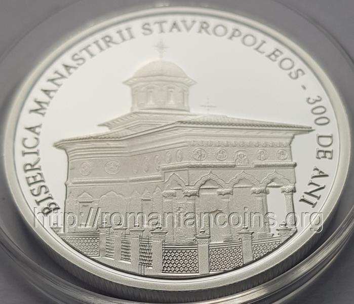 37 mm diametru, 31.103 g, argint 99.9%, margine cu zimţi Avers: ROMANIA, stema României, valoarea nominală 10 LEI, anul 2024, ornamente în stil brâncovenesc din pridvorul bisericii Stavropoleos | Revers: inscripția BISERICA MANASTIRII STAVROPOLEOS – 300 DE ANI și o imagine a bisericii Stavropoleos