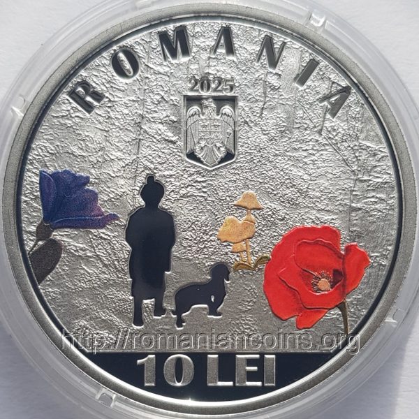 37 mm diametru, 31.103 g, argint 99.9%, margine cu zimţi Avers: ROMANIA, anul 2025, stema României, valoarea nominală 10 LEI, o imagine inspirată din filmul turnat după povestea „Dumbrava minunată” a lui Sadoveanu; în prim-plan, ca siluete, sînt Lizuca și cățelul ei Patrocle; trei elemente ale desenului sînt colorate | Revers: Mihail Sadoveanu, inscripţia MIHAIL SADOVEANU 1880 - 1961
