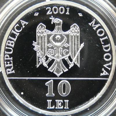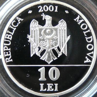 24.5 mm diametru, 13.5 g, 92.5% argint, margine netedă valoarea nominală 10 LEI, anul 2001 între două mici semne rombice, REPUBLICA MOLDOVA și stema Republicii Moldova |