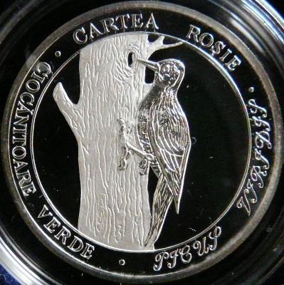 24.5 mm diametru, 13.5 g, 92.5% argint, margine netedă valoarea nominală 10 LEI, anul 2001 între două mici semne rombice, REPUBLICA MOLDOVA și stema Republicii Moldova | în cerc liniar interior o ciocănitoare verde (zisă și ghionoaie) pe un trunchi de copac, inscripția circulară · CARTEA ROȘIE · CIOCĂNITOARE VERDE · PICUS VIRIDIS (numele științific e cu litere mari de mînă) Data emisiunii: 5 noiembrie 2001 Tiraj maxim: 1000 de monede |