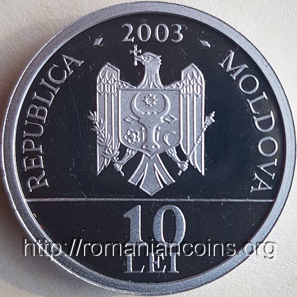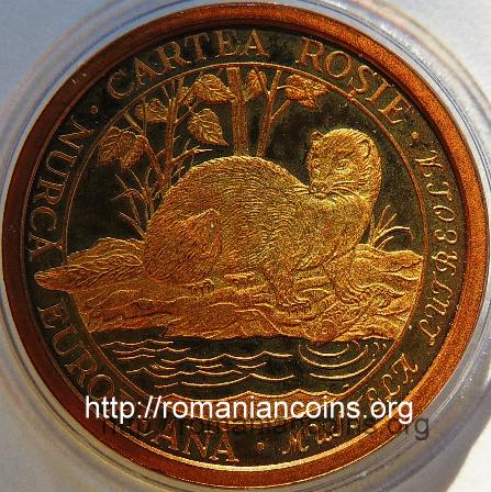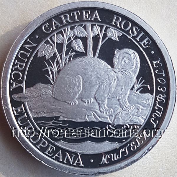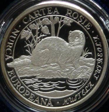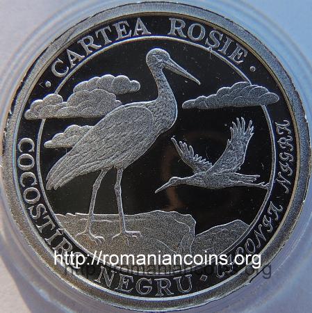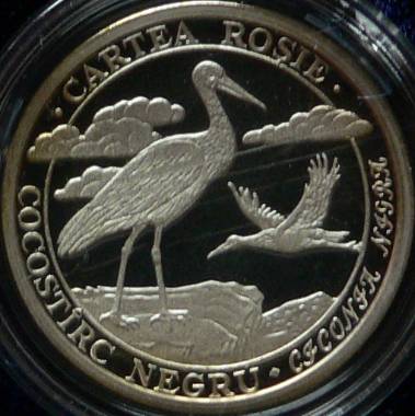 24.5 mm diametru, 13.5 g, 92.5% argint, margine netedă valoarea nominală 10 LEI, anul 2003 în cerc liniar interior două berze negre (cocostîrci), una pe sol și alta în zbor, inscripția circulară · CARTEA ROȘIE · COCOSTÎRC NEGRU ♦ CICONIA NIGRA (numele științific e cu litere mari de mînă) Data emisiunii: 20 august 2003 Tiraj maxim: 500 de monede | în cerc liniar interior o nurcă pe malul apei, inscripția circulară · CARTEA ROȘIE · NURCĂ EUROPEANĂ · MUSTELA LUTREOLA (numele științific e cu litere mari de mînă) Data emisiunii: 20 august 2003 Tiraj maxim: 500 de monede |