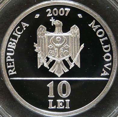 24.5 mm diametru, 13.5 g, 92.5% argint, margine netedă valoarea nominală 10 LEI, anul 2007 între două mici semne rombice, REPUBLICA MOLDOVA și stema Republicii Moldova |