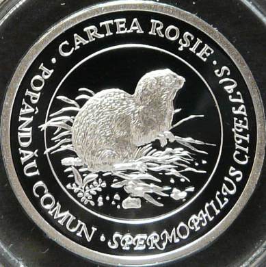 Din seria Cartea roșie au apărut pînă în prezent (iulie 2021) următoarele monede de argint de 10 lei: - pisica sălbatică și ciocănitoarea verde în 2001, - barza neagră și nurca europeană în 2003, - jderul de pădure în 2004, - acvila în 2005, - dropia în 2006, - popîndăul comun în 2007 și - nufărul alb în 2008. Au fost bătute și următoarele monede de 50 de lei: - lopătarul în 2011, - vidra și papucul doamnei în 2012, - lebăda cucuiată și libelula Coenagrion mercuriale în 2013, - țigănușul și bujorul de pădure în 2014, - broasca țestoasă de baltă în 2015, - gîsca cu gît roșu în 2016, - garofița Dianthus deltoides în 2018, - șoimul Falco cherrug în 2018, - ghiocelul bogat în 2019 și - fluturele coadă de rîndunică Papilio machaon în 2020. Despre popîndăul comun - Spermophilus citellus Popîndăul este un mic mamifer (are cam 20 de centimetri lungime și cam un sfert de kilogram) ce trăiește în colonii, preferînd locurile secetoase. Fiecare popîndău își sapă o vizuină proprie sub pămînt, din care iese în timpul zilei în căutarea hranei. I se mai spune și țiștar. Este înrudit cu veverița, care și ea face parte din familia Sciuridae. (după Ion Simionescu, Fauna României) |