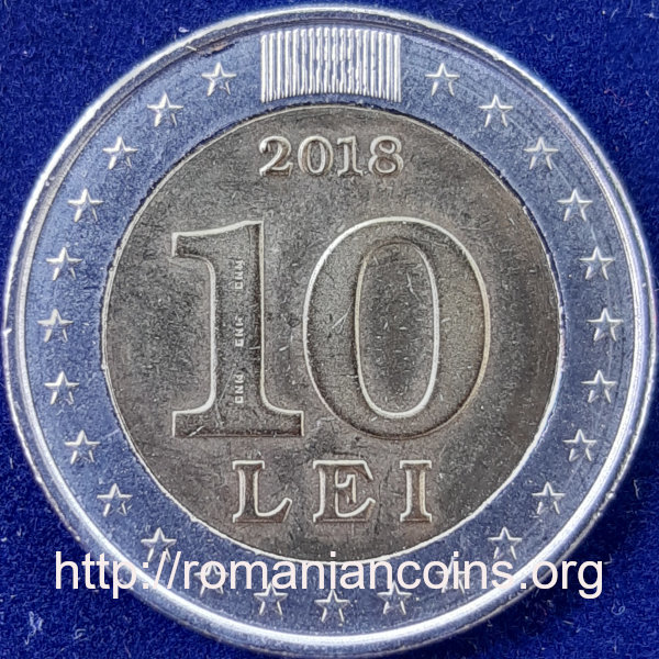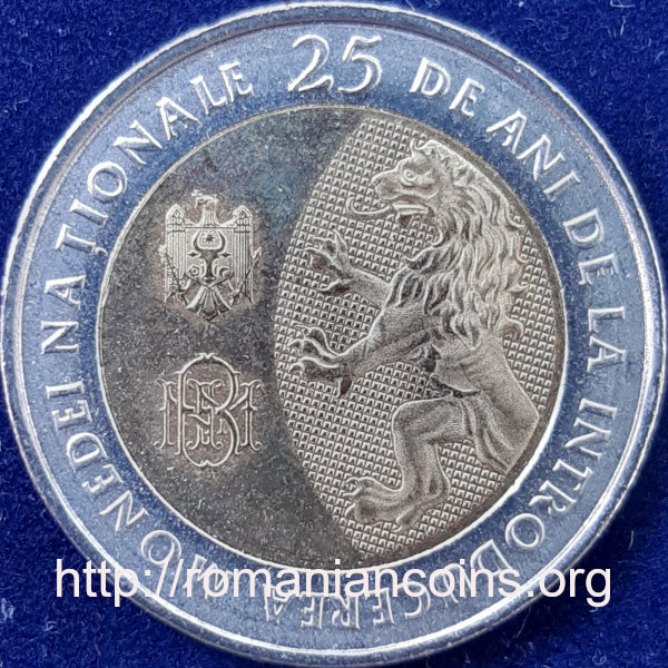 25.3 mm diametru, 7.65 g, oțel placat cu alamă pe discul interior și placat cu nichel pe inelul exterior, margine cu zimți avînd inscripția incusă ★ MOLDOVA (de două ori) valoarea nominală 10 LEI, cu microtextul BNM (Banca Națională a Moldovei) scris de trei ori pe corpul cifrei 1, anul 2018; sus un patrulater din linii verticale pe care se formează monograma R M (de la Republica Moldova) ca imagine latentă; literele pot fi văzute pe rînd prin înclinarea monedei de la stînga la dreapta; pe inelul exterior sînt 25 de stele cu cîte cinci raze, ★, cîte o stea pentru fiecare an de existență a leului moldovenesc | discul central este împărțit de un arc de cerc în două zone; în stînga stema Republicii Moldova și sigla BNM a Băncii Naționale a Moldovei, în dreapta un leu heraldic în stilul celor reprezentați pe talerii-leu olandezi medievali (de la care a venit denumirea de leu dată monedei naționale), pe inelul exterior inscripția circulară 25 DE ANI DE LA INTRODUCEREA MONEDEI NAȚIONALE