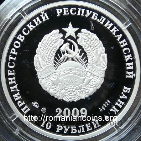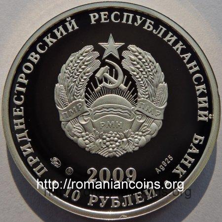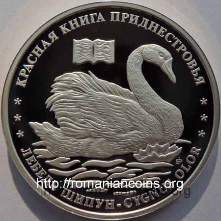 Avers: 32 mm diametru, 14.14 g, argint 92.5%, margine netedă valoarea nominală 10 RUBLEI, stema autoproclamatei republici transnistrene (cu secera și ciocanul), inscripția · PRIDNESTROVSKII RESPUBLIKANSKII BANK · (cu litere chirilice) însemnînd BANCA REPUBLICANĂ [TRANS] NISTREANĂ, anul 2009, la stînga semne de monetărie (MMD și cap de rusoaică), la dreapta Ag925 reprezentînd titlul argintului | Revers: o lebădă plutind pe ape, o carte - Cartea roșie, inscripțiile *** KRASNAIA KNIGA PRIDNESTROVIIA *** și LEBEDI ȘIPUN (cu litere chirilice, în limba rusă) însemnînd CARTEA ROȘIE A [TRANS]NISTRIEI și LEBĂBĂ MUTĂ, și, cu litere latine, numele științific al lebedei, - CYGNUS OLOR; în dreptul literei L din OLOR siglă Tiraj: 500 exemplare |