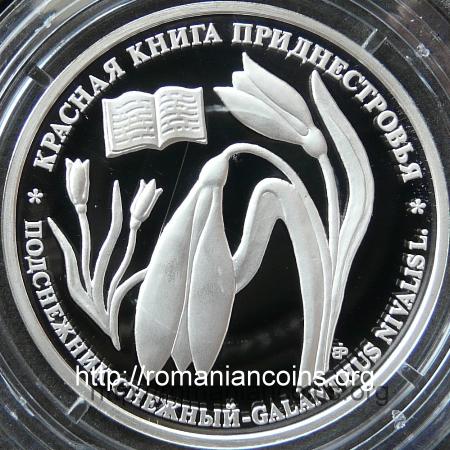 | Avers: 32 mm diametru, 14.14 g, argint 92.5%, margine netedă valoarea nominală 10 RUBLEI, stema autoproclamatei republici transnistrene (cu secera și ciocanul), inscripția · PRIDNESTROVSKII RESPUBLIKANSKII BANK · (cu litere chirilice) însemnînd BANCA REPUBLICANĂ [TRANS] NISTREANĂ, anul 2009, la stînga semne de monetărie (MMD și cap de rusoaică), la dreapta Ag925 reprezentînd titlul argintului | Revers: ghiocei, o carte - Cartea roșie, inscripțiile KRASNAIA KNIGA PRIDNESTROVIIA și PODSNEJNIK SNEJNÎI (cu litere chirilice, în limba rusă) însemnînd CARTEA ROȘIE A [TRANS]NISTRIEI și GHIOCEL DE ZĂPADĂ, și, cu litere latine, numele științific al ghiocelului comun, GALANTHUS NIVALIS L. în dreptul literei H din GALANTHUS siglă Tiraj: 500 exemplare |