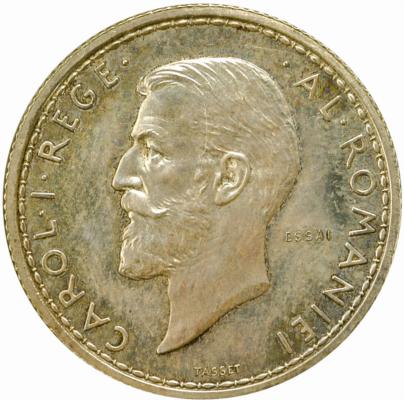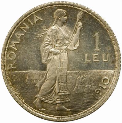 | 23 mm diametru, 5 g, argint 83.5%, cupru 16.5%, margine cu zimți valoarea nominală 1 LEU, ROMANIA, anul 1910, țărancă torcînd, cu fusul în mîna dreaptă, cu furca de tors și secera în brîu, BASSARAB în stînga, de-a lungul circumferinței (însemn al gravorului Costache Bassarab) |