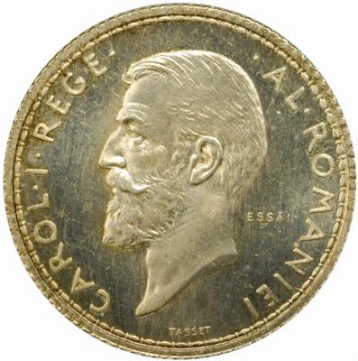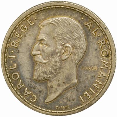 inscripția CAROL·I·REGE· ·AL·ROMANIEI și efigia regelui, spre stînga. Sub gît este scris numele gravorului, TASSET. În dreapta, în cîmp, inscripția ESSAI însemnînd probă în limba franceză. |