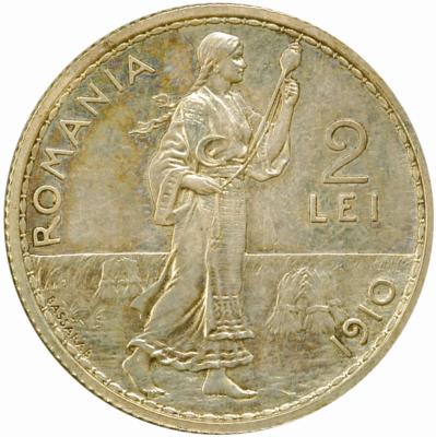 | 27 mm diametru, 10 g, argint 83.5%, cupru 16.5%, margine cu zimți valoarea nominală 2 LEI, ROMANIA, anul 1910, țărancă torcînd, cu fusul în mîna dreaptă, cu furca de tors și secera în brîu, pe fundal cîmp cu snopi de grîu, BASSARAB în stînga, de-a lungul circumferinței (însemn al gravorului Costache Bassarab) |