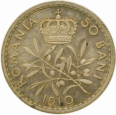 | 18 mm diametru, 2.5 g, argint, margine cu zimți valoarea nominală 50 BANI, ROMANIA, anul 1910, coroană și ramură de măslin |