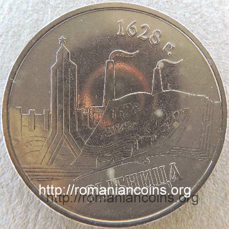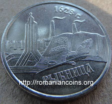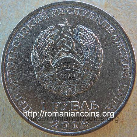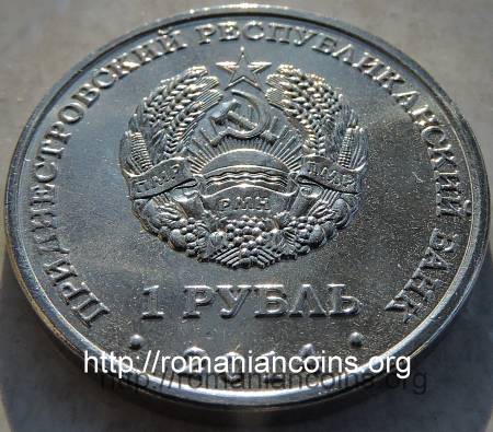 22 mm diametru, 4.65 g, oțel placat cu nichel, margine netedă Avers: valoarea nominală 1 RUBLI, stema autoproclamatei republici transnistrene (cu secera și ciocanul), inscripția · PRIDNESTROVSKII RESPUBLIKANSKII BANK · (cu litere chirilice) însemnînd BANCA REPUBLICANĂ [TRANS] NISTREANĂ, anul 2014 | Revers: în stînga monumentul soldatului sovietic, cu steaua roșie în vîrf, în dreapta o carte deschisă (cronica localității) pe care scrie 1626 OSNOVANIA RÎBNIȚÎ însemnînd 1626 ÎNTEMEIEREA RÎBNIȚEI - călimară și pană de scris, în plan secund o imagine cu uzina metalurgică din oraș, sus inscripția 1628 G. însemnînd (anul) 1628, în exergă inscripția RÎBNIȚA (cu litere chirilice) Tiraj: 50.000 de exemplare |