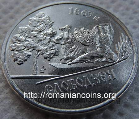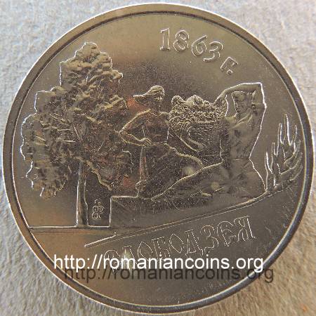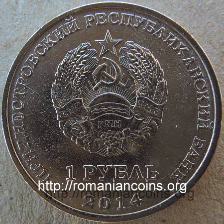 22 mm diametru, 4.65 g, oțel placat cu nichel, margine netedă Avers: valoarea nominală 1 RUBLI, stema autoproclamatei republici transnistrene (cu secera și ciocanul), inscripția · PRIDNESTROVSKII RESPUBLIKANSKII BANK · (cu litere chirilice) însemnînd BANCA REPUBLICANĂ [TRANS] NISTREANĂ, anul 2014 | Revers: grup statuar cu un țăran și cu o țărancă, situat la marginea localității, sus inscripția 1863 G. însemnînd (anul) 1863, în exergă inscripția SLOBODZEIA (cu litere chirilice) Tiraj: 50.000 de exemplare |