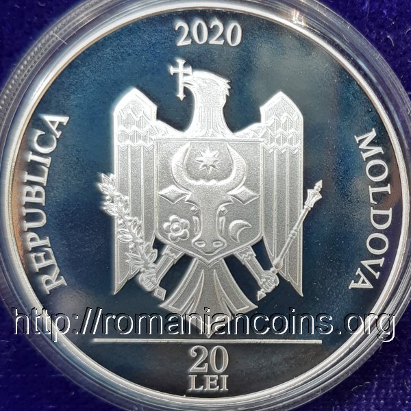 35 mm diametru, 20 g, tombac argintat, margine cu zimți anul 2020, REPUBLICA MOLDOVA, stema Republicii Moldova, în exergă linie orizontală și valoarea nominală 20 LEI |