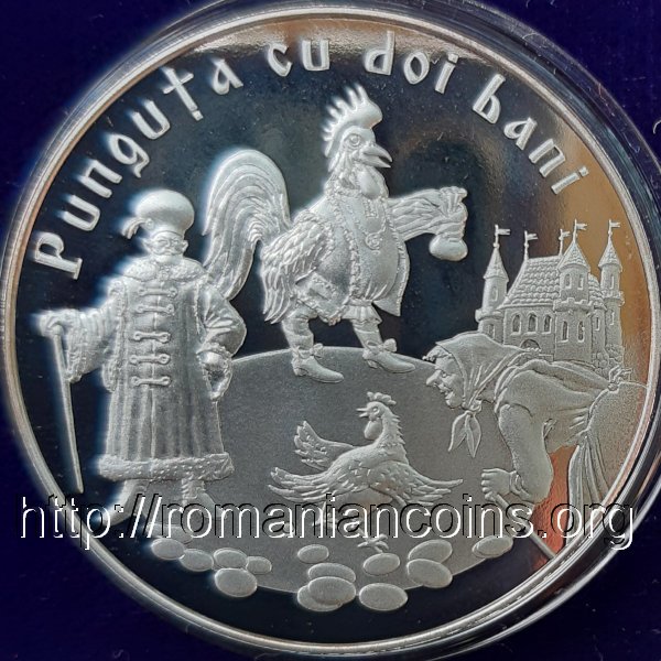 moşul, cocoşul ţinînd cu aripa stîngă celebra punguţă, ambii îmbrăcaţi boiereşte, găina şi cîteva ouă, baba îmbrăcată ca o bătrînă de la ţară, un castel pe fundal, inscripţia „Punguţa cu doi bani”.