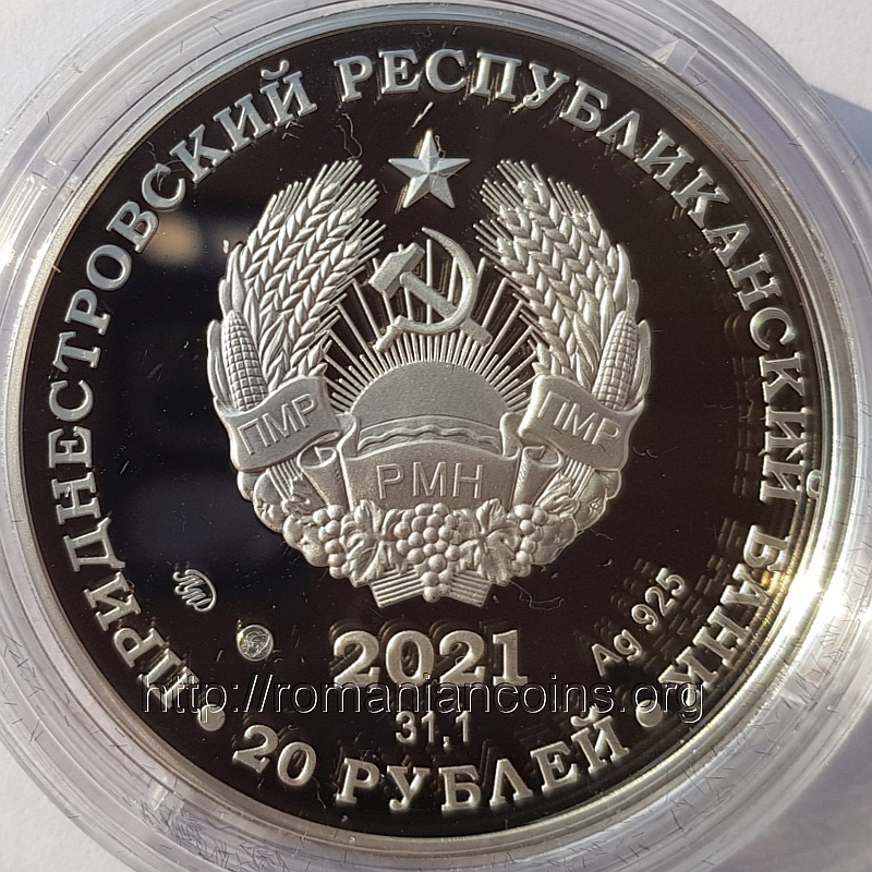 39 mm diametru, 31.1 g, argint 92.5%, margine netedă Avers: valoarea nominală 20 RUBLEI, stema autoproclamatei republici transnistrene (cu secera și ciocanul), inscripția · PRIDNESTROVSKII RESPUBLIKANSKII BANK · (cu litere chirilice) însemnînd BANCA REPUBLICANĂ [TRANS] NISTREANĂ, anul 2021, la stînga semne de monetărie (MMD și cap de rusoaică - posibil marcajul rusesc pentru bijuterii de argint), la dreapta Ag925 reprezentînd titlul argintului, dedesubt 31,1, reprezentînd masa monedei în grame | Revers: o imagine colorată a unui mărțișor, inscripția Mărțișor (cu litere chirilice), pe circumferință o bandă colorată cu un ornament național românesc