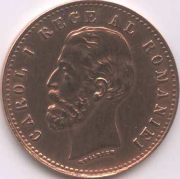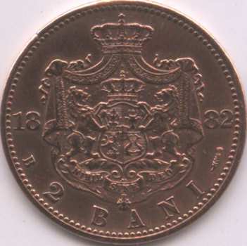 20 mm diametru, 2 g, cupru 95%, staniu 4%, zinc 1%, margine netedă valoarea nominală 2 BANI, anul 1882, stema României, litera B și spic de grîu, cerc perlat exterior | inscripția CAROL I REGE AL ROMANIEI și efigia regelui spre stînga, cerc perlat exterior. Sub gît este scris numele gravorului, KULLRICH. Tiraj: 5.000.000 piese |