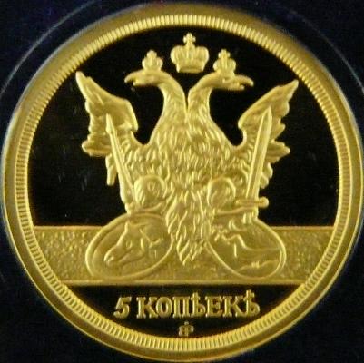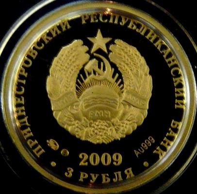 margine netedă valoarea nominală 3 RUBLEA, stema autoproclamatei republici transnistrene (cu secera și ciocanul), inscripția · PRIDNESTROVSKII RESPUBLIKANSKII BANK · (cu litere chirilice) însemnînd BANCA REPUBLICANĂ [TRANS] NISTREANĂ, anul 2009, la stînga semne de monetărie, la dreapta Au999 reprezentînd titlul aurului | Revers: reproducerea unei fețe a probei piesei de 5 copeici 1771 ce ar fi trebuit să circule în Moldova și în Țara Românescă: vulturul bicefal al Imperiului Țarist, cu amîndouă capetele încoronate și cu o coroană deasupra, ținînd în gheare spada și sceptrul și stînd pe două scuturi pe care se află stemele Moldovei și Munteniei, o bandă orizontală și valoarea nominală 5 KOPIEKI, cu litere chirilice, dedesubt siglă