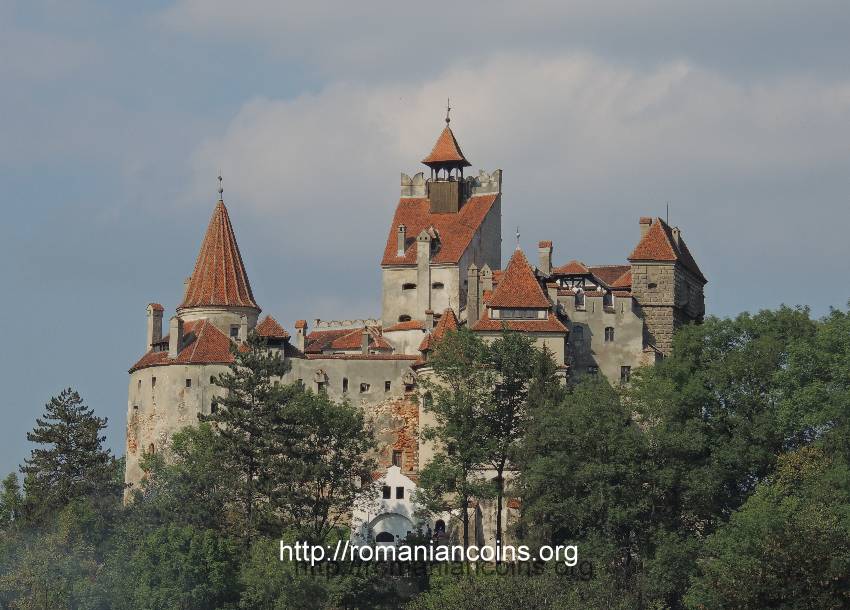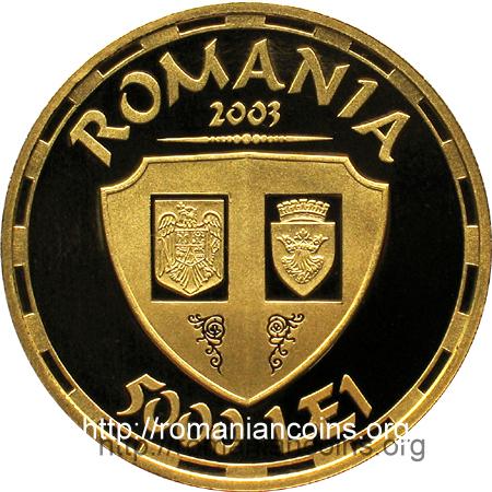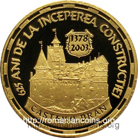 35 mm diametru, 31.103 g, aur 99,9%, margine netedă Avers: ROMANIA, anul 2003, o linie ornamentală, un scut pe care se află stema României, stema orașului Brașov și două ornamente vegetale, valoarea nominală 5000 LEI | Revers: imaginea castelului Bran, un scut purtînd anii 1378 și 2003, inscripția circulară 625 ANI DE LA INCEPEREA CONSTRUCTIEI și, pe o eșarfă, CASTELUL BRAN