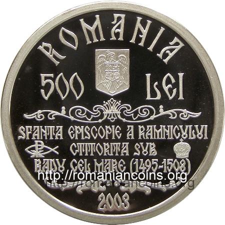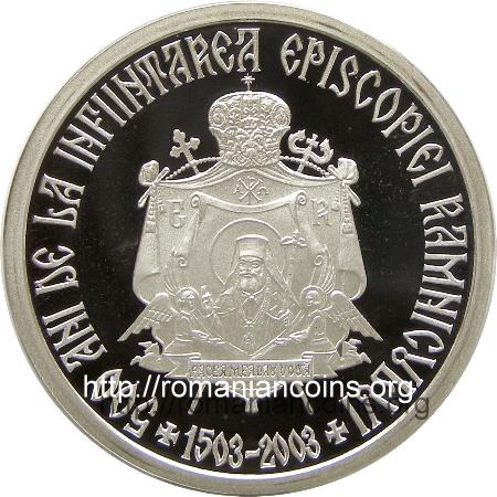 37 mm diametru, 31.103 g, argint 99,9%, margine netedă Avers: ROMANIA, valoarea nominală 500 LEI, stema României, anul 2003 și, între ornamente, inscripția SFANTA EPISCOPIE A RAMNICULUI CTITORITA SUB RADU CEL MARE (1495-1508) | Revers: stema Episcopiei Rîmnicului și inscripția circulară 500 ANI DE LA INFIINTAREA EPISCOPIEI RAMNICULUI +1503-2003+