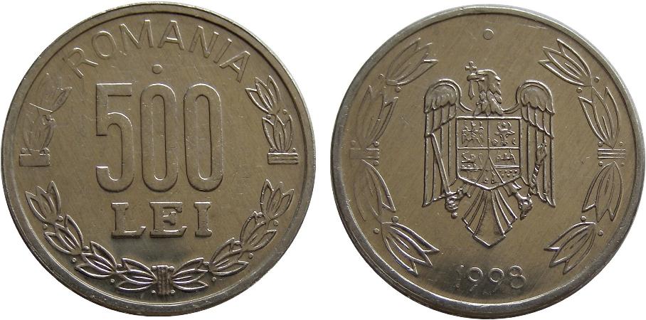 25 mm diametru, 5.5 g, nichel valoarea nominală 500 LEI, cunună din frunze de laur, în partea de sus ROMANIA | la stînga și la dreapta coroane de lauri, stema României, deasupra globulă, dedesubt anul 1998 |
