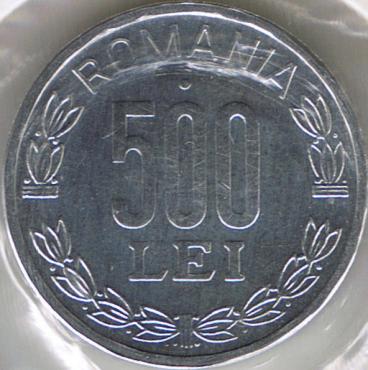 25 mm diametru, ~4 g, probabil AlMg3, muchie netedă Gravat pe muchie: ROMANIA (de trei ori) valoarea nominală 500 LEI, cunună din frunze de laur, în partea de sus ROMANIA | la stînga și la dreapta coroane de lauri, stema României, deasupra globulă, dedesubt anul 1998 |