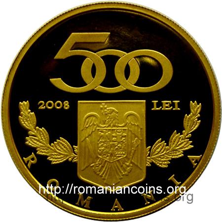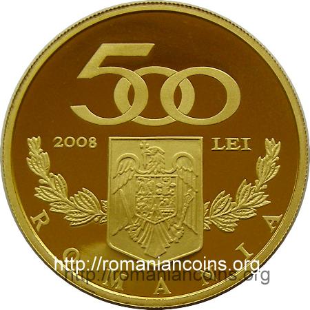35 mm diametru, 31.103 g, aur 99.9%, margine cu zimți valoarea nominală 500 LEI, anul 2008, stema României deasupra unei cununi de lauri, ROMANIA |