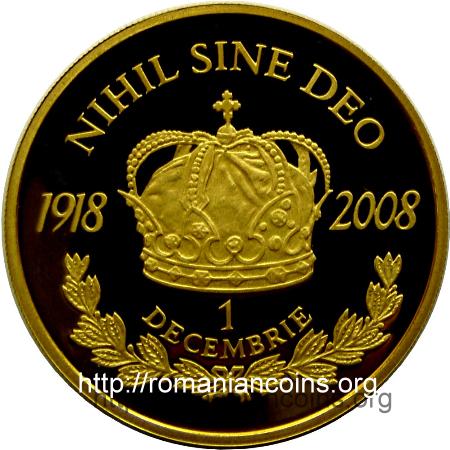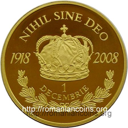 coroana de oțel a regilor României, sus inscripția NIHIL SINE DEO, anii 1918 și 2008, jos inscripția 1 DECEMBRIE într-o cunună de lauri