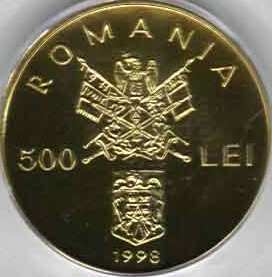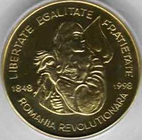 24 mm diametru, 8.64 g, aur 90%, margine netedă Avers: valoarea nominală 500 LEI, ROMANIA, anul 1998, stema României și o compoziție heraldică simbolizînd revoluția română de la 1848. | Revers: inscripția circulară LIBERTATE EGALITATE FRATIETATE, anii 1848 și 1998, ROMANIA REVOLUTIONARA, în centru un desen inspirat din tabloul România revoluționară” al pictorului Constantin David Rosenthal
