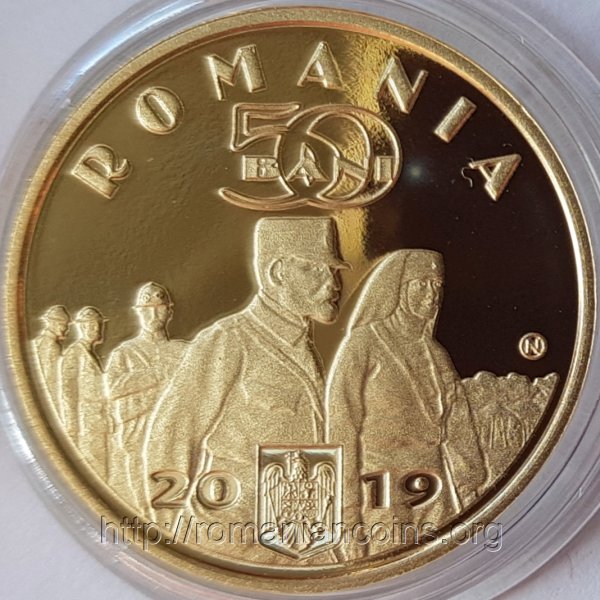 23.75 mm diametru, 6.1 g, alamă Cu80Zn15Ni5, margine netedă, cu inscripţia ROMANIA (de două ori)Avers: ROMÂNIA, valoarea nominală 50 BANI, anul 2019, stema României, regele Ferdinand I și regina Maria vizitînd trupele române pe front, litera N (de la Numismatică) într-un cerc | Revers: portretul reginei și inscripția REGINA MARIA