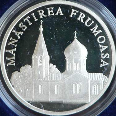 30 mm diametru, 16.5 g, 92.5% argint, margine netedă valoarea nominală 50 LEI, anul 2000 între două mici semne pătrate, REPUBLICA MOLDOVA și stema Republicii Moldova | inscripția circulară MĂNĂSTIREA FRUMOASA și o imagine a bisericii cu hramul Adormirii Maicii Domnului |