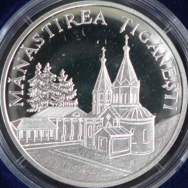 30 mm diametru, 16.5 g, 92.5% argint, margine netedă valoarea nominală 50 LEI, anul 2000 între două mici semne pătrate, REPUBLICA MOLDOVA și stema Republicii Moldova | inscripția circulară MĂNĂSTIREA ȚIGĂNEȘTI și o imagine de ansamblu a mănăstirii, cu biserica de vară și cu cea de iarnă |