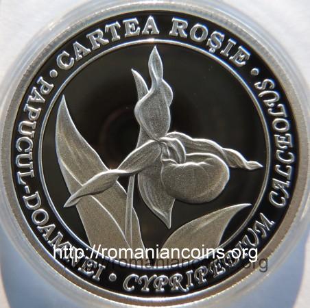 în cerc liniar interior o floare de papucul doamnei, inscripția circulară · CARTEA ROȘIE · PAPUCUL-DOAMNEI · CYPRIPEDIUM CALCEOLUS (numele științific e cu litere mari de mînă)