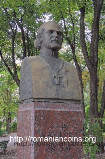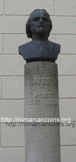 bustul lui Mateevici, anii 1888 și 1917 scriși sub formă de fracție, inscripția ALEXEI MATEEVICI